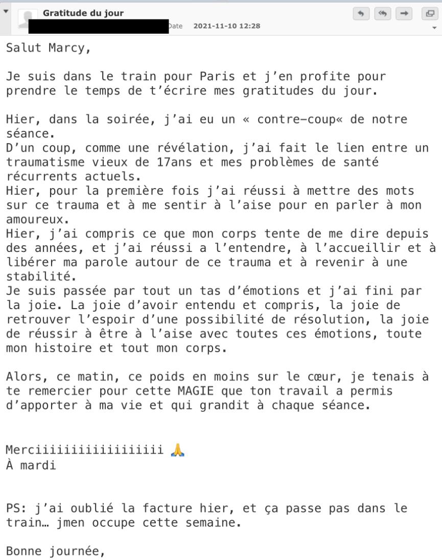 Faire cet accompagnement était une évidence pour moi. J’ai une profonde gratitude envers moi d’avoir franchi le cap et de me l’être offert.